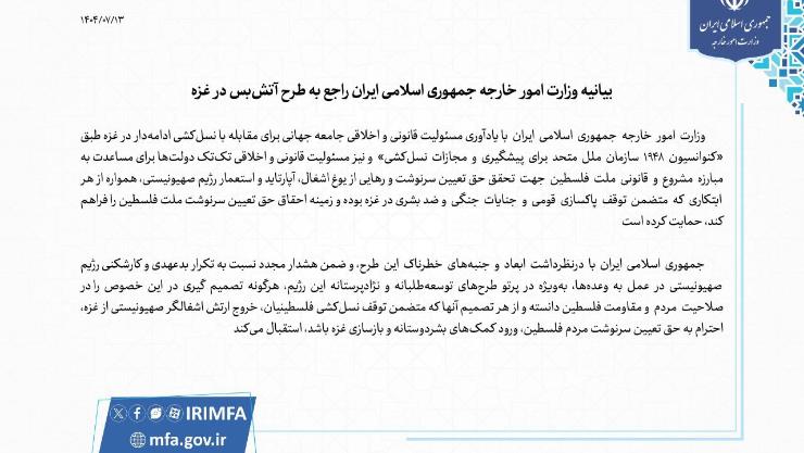 بیانیه وزارت امور خارجه جمهوری اسلامی ایران راجع به طرح آتشبس در غزه